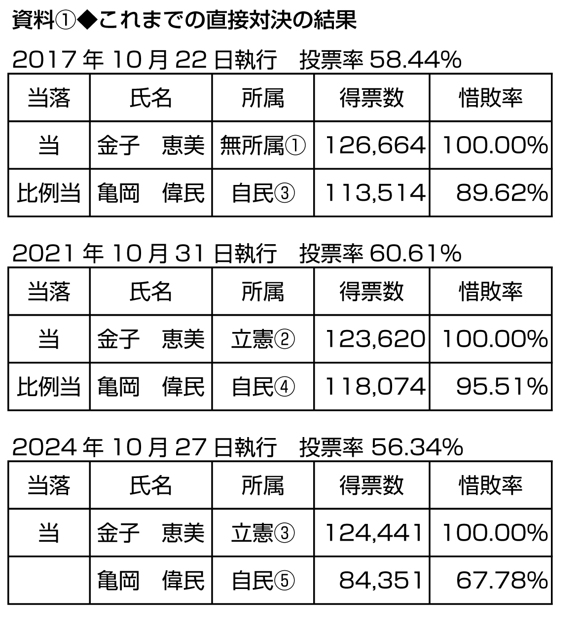 そして一昨年10月末の衆院選では、過去2回とも比例重複の復活当選だったことから、自民党の内規で比例登録が認められなかった亀岡偉民が背水の陣で臨んだものの、結果は、立憲民主党公認の金子恵美が4万票以上の大差を付けて大勝した。しかし、この時は旧安倍派の政治資金問題に端を発した政権与党への批判票が金子に来たに過ぎない。それはこれまでに3度、亀岡との一騎打ちを演じてきた票差からも明らかなはずである。(資料①)