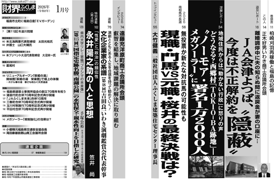 ・根本拓衆議院議員 福島から選ばれた政治家として福島のため、日本のために勝負していく・清原尚福島県医師会常任理事 医師の後継者問題に先駆的に取り組む福島県「医業承継バンク」事業・本間達也福島県老人保健施設協会長 超高齢社会が抱える社会課題へ向けて・前田泰彦福島県警備業協会長 価格転嫁に向けて警備員のレベル向上に力を入れる・齋藤記子福島県中小企業家同友会長 会員強化・増加を通じて必要とされる同友会づくりへ